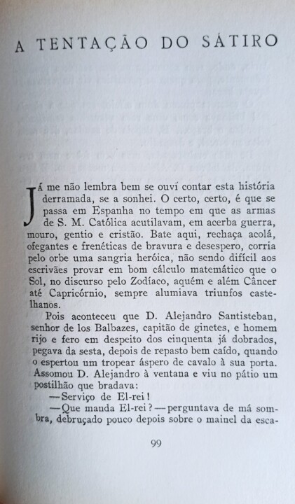 De coração alanceado, se bem que no parecer contrafazendo o muito nojo, ordenou D. Alejandro os aprestos da companhia que capitaneava. Não desprazia ao seu ânimo fragueiro e aventuroso a vida dura de campanha; pelo contrário; mas, naquele momento, pesava-lhe distrair-se, após breves meses de matrimónio, de sua senhora D. Mafalda, do ramo preclaro, embora pobre, dos Casarrubios. Ainda a ela o atavam os amavios da lua-de-mel; ainda a moça não perdera de todo o enleado ar de pupila, criadinha e medrada nos Balbazes, nem tão-pouco se afeiçoara a considerar como joelhos de amante os joelhos em que, como paternais, tantas vezes de fralda curta e madeixas soltas peloticara. Demais, agrilhoavam-no naquela casa, que encerrava flor de tanta bizarria, os zelos próprios dos seus cinquenta anos bem vividos; zelos que iam e vinham na consciência, ora repelidos pelo respeito que, em obras e pensares, devia à sua dama, ora calculados pelos percalços possíveis da honra, que a imaginação, à ideia de distância, mais e mais exacerbava. Amava de raiz, e para seu afecto a separação era crueza; amava com todos os ciúmes do homem na passagem do equador, e, para tal estado, o apartamento é uma esponja com as triagas todas do inferno.» ...